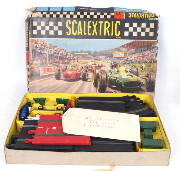 An original vintage Scalextric racing set No. 31. Within the original pictorial box. Appears complete, with instructions, both cars and controllers etc.