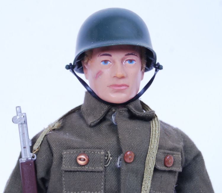 An original vintage Palitoy made Action Man figure / doll. Dressed in full British Infantry uniform, with rifle. Uniform looks complete. Hands in tact, figure appears mint.