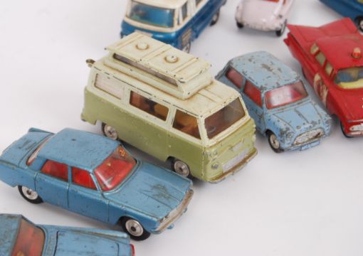 A collection of 15x original vintage unboxed Corgi diecast models to include; Reliant Bond Bug, Film Service Van, 2x Heinkels, Bedford, Jaguar Mk X, Fire Chief's Car and others.