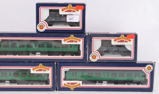 A collection of 5x Bachmann 00 gauge railway trainset rolling stock and carriages. All boxed. 34-500, 34-526, 34-525, 33301A x2.