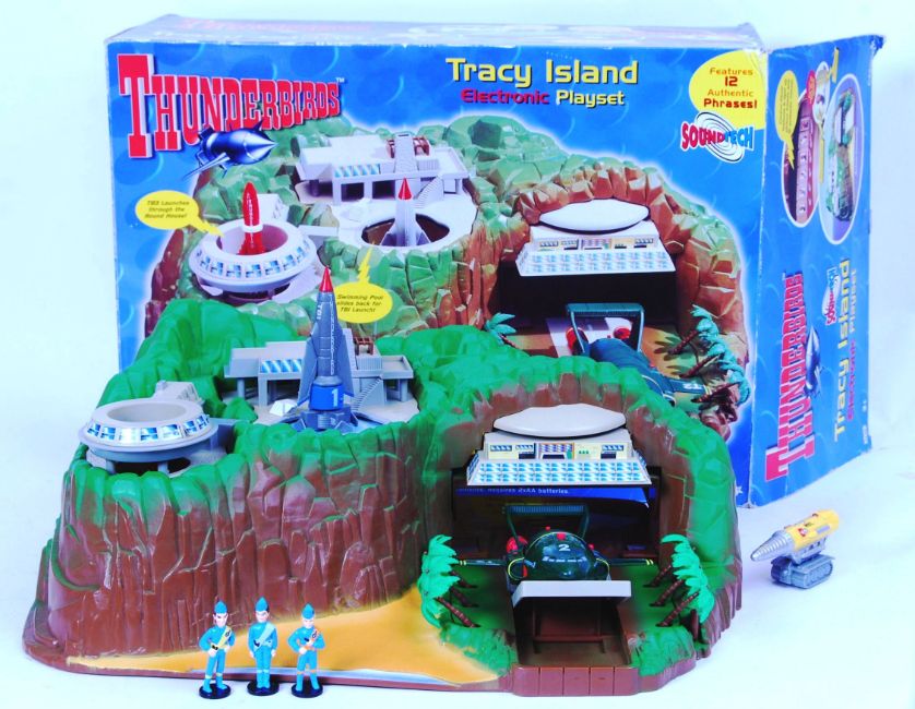 A Thunderbirds Carlton Soundtech Tracy Island Electronic Playset. 100% complete, and working (vendor assures), along with all the 'sold separately' Thunderbird ships and figures. Within a good original box. Working lights and sound.
