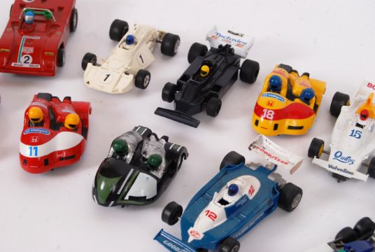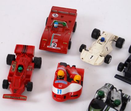 A collection of 12x original vintage Scalextric cars, to include motorcycles and sidecars, Polistil slot racing car, C124, C281, C129 etc.