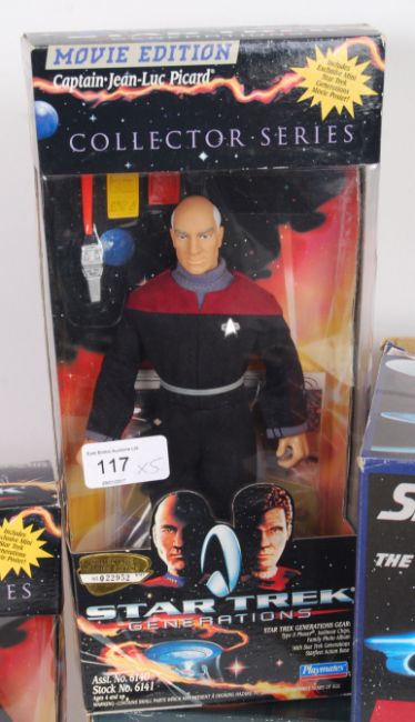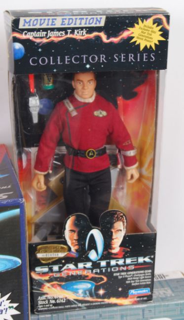 A collection of Star Trek boxed items to include 3x Playmates Star Trek 'Generations' boxed 12" action figures, and 2x vintage Wesco alarm clocks. All within the original boxes.