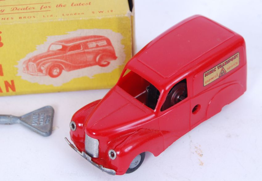 A vintage Triang Minic clockwork Austin A40 Van, in red. Within the original box. Complete with original key.