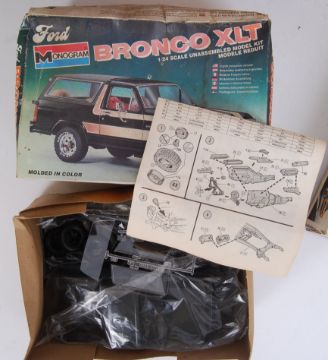 A collection of 7x rare 1:25 (and similar) scale plastic model kits. All vehicles. To include; MPC Gangbusters, Revell Dodge Revellion Funny Car, Airfix 1:24 Ford J, Monogram Hurst Hairy Olds Funny Car, Revell Mickey Thompson's Challenger I, Monogram Boot Hill Express, and Monogram Ford Bronco XLT (unused, some contents sealed). Most appear fully made / part made to a fairly good standard. All within the original boxes. Some rare.