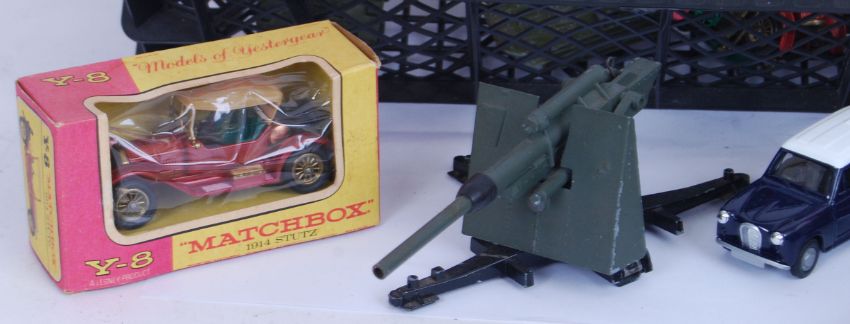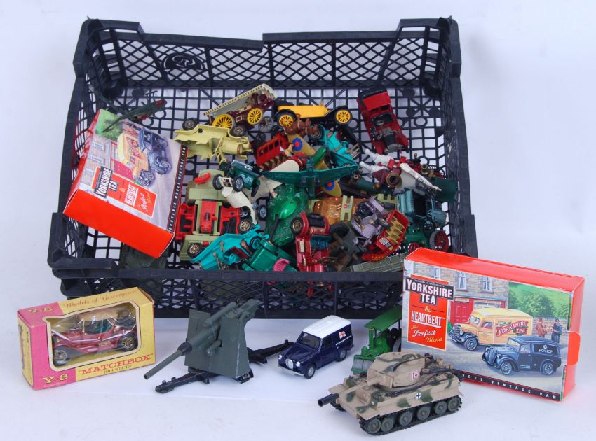 A box of assorted loose (and some boxed) diecast models. To include Dinky 88mm Gun, Matchbox Models Of Yesteryear, 2x boxed Yorkshire Tea models and a boxed Matchbox Models Of Yesteryear Y-8 Stutz. Some military themed.