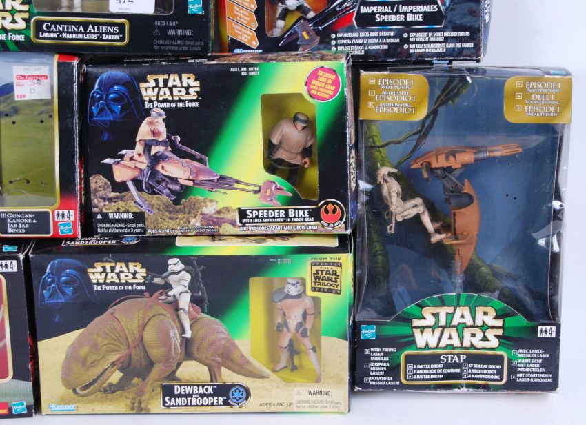 A collection of 6x Star Wars Kenner and Hasbro playsets. Comprising of: Power Of The Force Cantina Aliens, Episode One Gungan Cannon, Episode One Jabba The Hutt, Power Of The Force Dewback, Power Of The Force Speederbike, Stap, and Imperial Speederbike. All within the original boxes, some appearing unused.
