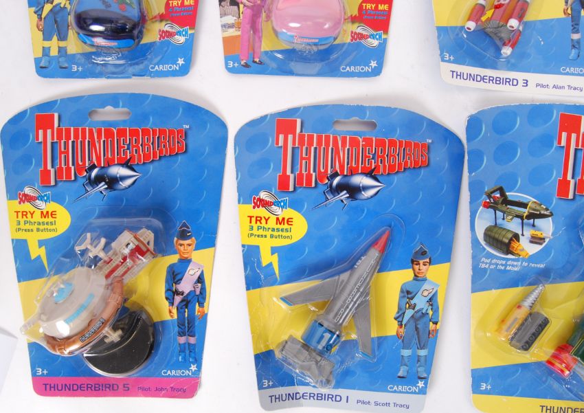A collection of assorted Thunderbirds diecast and plastic carded action figures and vehicles. All by Vivid Imaginations. Carded, unused.