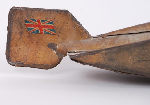A rare antique Gunthermann made tinplate clockwork model, of 'The Golden Arrow' land speed record car c1929. The tail fin decorated with a Union Jack. With original key, 55cm long The Golden Arrow was built for Sir Henry Segrave (1896-1930). Segrave broke the land speed record at Daytona Beach on 11 March 1929 with a speed of 231.45 mph. Rare toy. AF - one wheel missing.