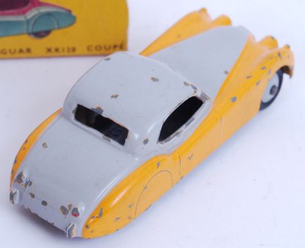 An original vintage Dinky diecast model 157 Jaguar XK 120 Coupe. Orange and grey, within the original box.