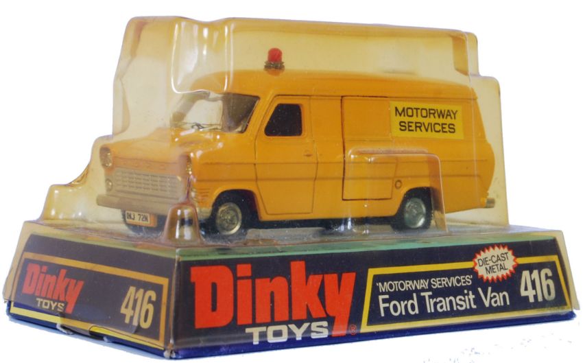 An original vintage Dinky Toys diecast model No. 416 Ford Transit Motorway Services Van. Model appears mint+ within a very near mint original box (upper display portion yellowed, but uncracked). Possibly never removed from box.