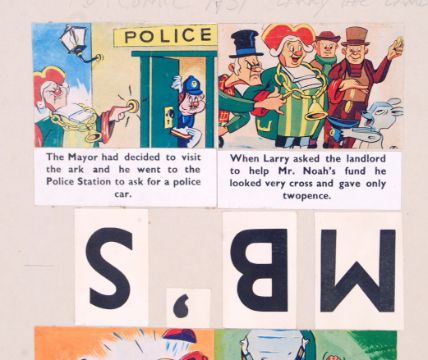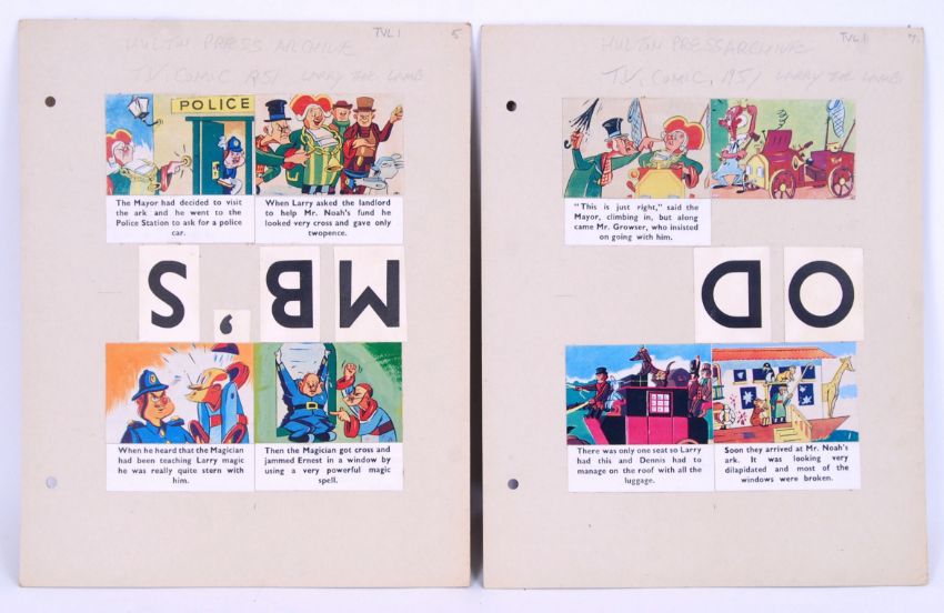 2x original 1950's TV Comic artwork boards for Eagle Film / TV Comic slides. Featuring artwork from original annuals painted / altered for use in the cineslides. These boards featuring artwork for Larry The Lamb by SG Hulme Beaman. 42cm x 33cm. From the Hulton Press Archive.