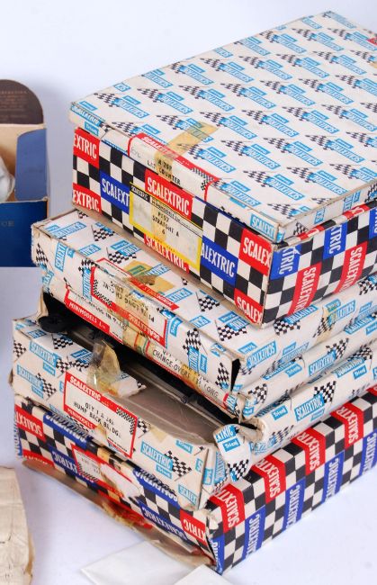 A collection of assorted vintage Scalextric trackside accessories / buildings etc. All boxed, to include; PT83 Right Angle Crossing, A248 Hump Back Bridge, PT78 Skid Chicane, A211 First Aid Hut, A203 Owner Stand & Pit, A 202 Racing Pit, F303 Starter On Rostrum, PT57 Straight, PT82 Change Overs In Pairs, PT77 Goodwood Chicane Set and others. All with boxes.