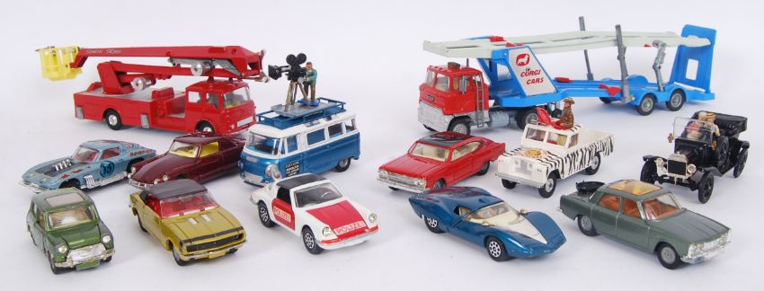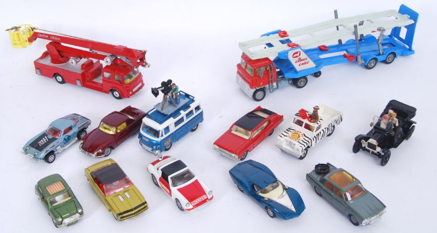 A good collection of 13x vintage Corgi diecast model cars and other vehicles. To include Simon Snorkel Fire Engine, Film Service Van, 2x Golden Jacks variations, Mini, Land Rover etc. Most very good, some near mint.