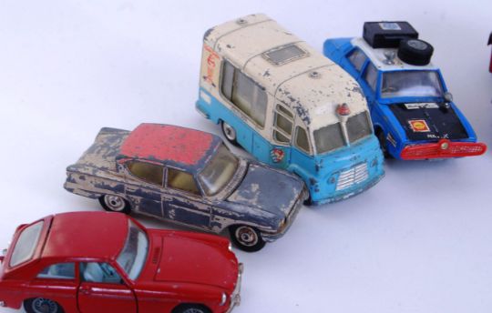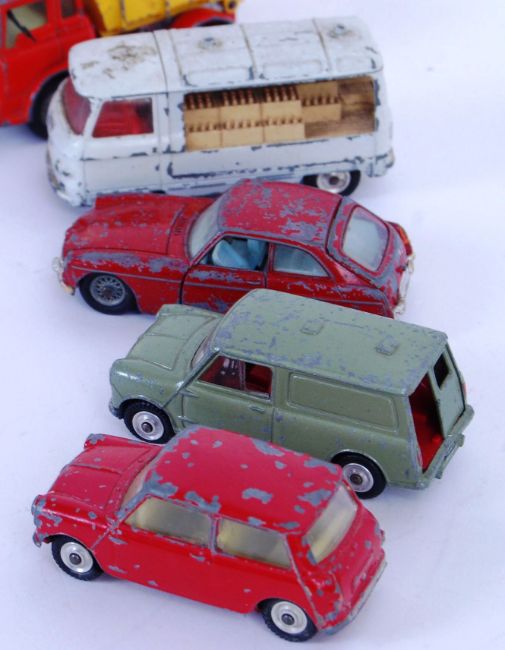 A collection of 10x original vintage Corgi loose diecast models. To include 3x minis, MGB BT, Ford Consul, Smiths Karrier Ice Cream Van, Hillman Hunter (missing a wheel) and others.
