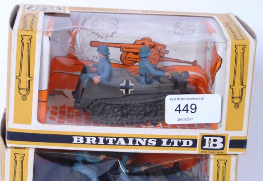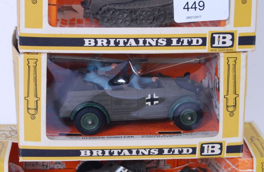 A collection of 3x Britains German Military diecast model vehicles - 9732 Field Gun, 9783 Scout Car and 9780 Half Track. All within the original boxes.