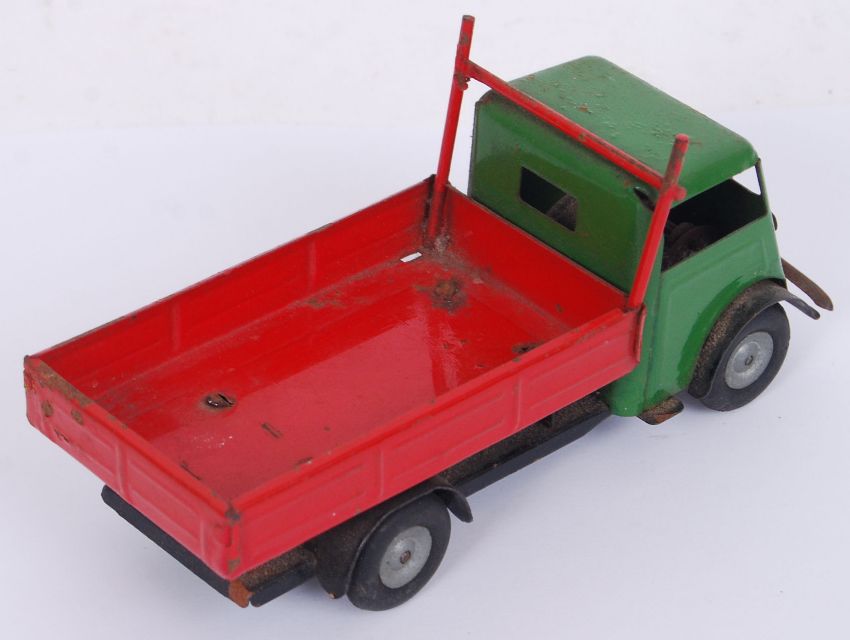 An original vintage tinplate clockwork Triang Minic flatbed truck. Green cab with red flatbed and black chassis.