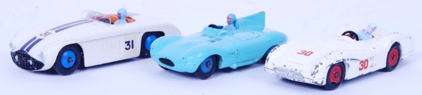 A collection of 3x vintage Dinky diecast models, unboxed; 237 Mercedes Benz, 238 Jaguar Type D and 133 Cunningham (restored). All unboxed.