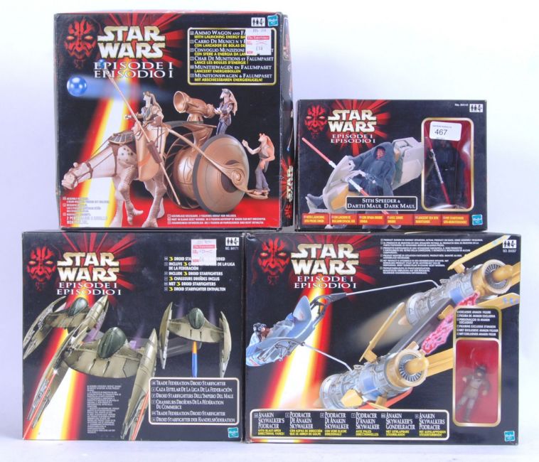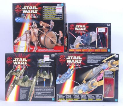 A collection of 4x Star Wars Episode One playsets, all by Hasbro. Comprising of; Trade Federation Droid Starfighter, Sith Speeder, Ammo Wagon, Anakin Skywalker's Podracer. Most appear to be possibly unused, with original inner packing. All within the original boxes.