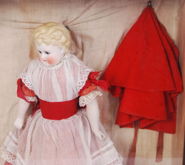 A rare Victorian antique continental bisque / glass headed porcelain doll. Highly detailed blue glass eyes. With original period costume. Mounted within a wooden display glass fronted cabinet. The cabinet measuring; 56cm high, 54cm wide and 15cm deep. The doll measuring approx; 44cm tall. No damage to the doll, all fingers in tact.