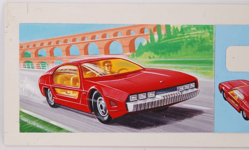 A fabulous original piece of box artwork for Matchbox Lesney Superfast diecast model No.20 Lamborghini Marzel. On the original printers board / sheet. Possibly for the Canadian marked. Original watercolour and pastel, bold bright colours. Superb example. 11cm x 23cm approx.