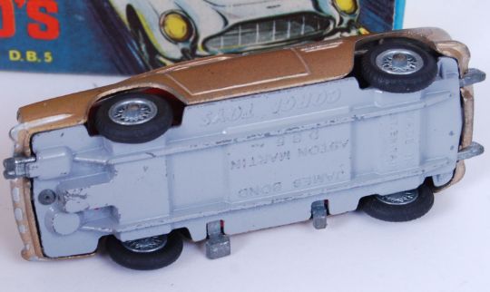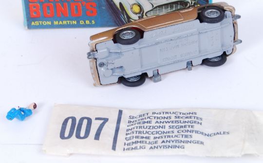 An original vintage Corgi James Bond 007 diecast model Gold Aston Martin DB5 No. 261, within the original box, with original cardboard display stand. Comes with correct secret instructions, packet and spare ejector seat figure. The model in fair to good condition, with boxes being fair to good also, outer box very good.