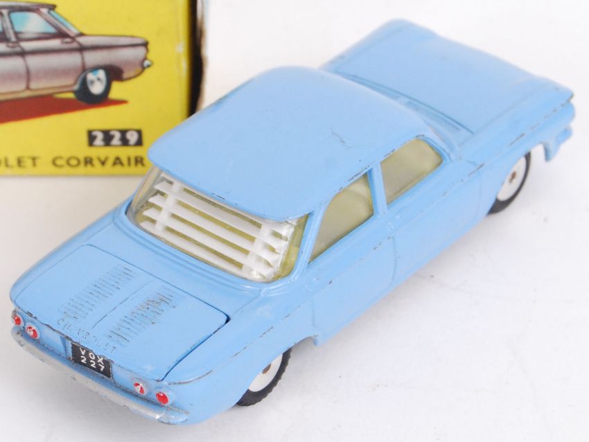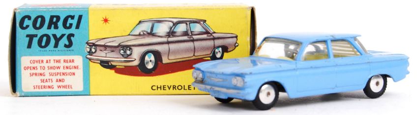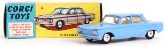 An original vintage Corgi diecast model 229 Chevrolet Corvair. In blue, with tax disc. Within the original box.