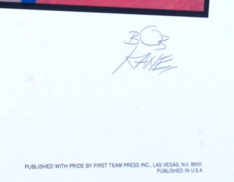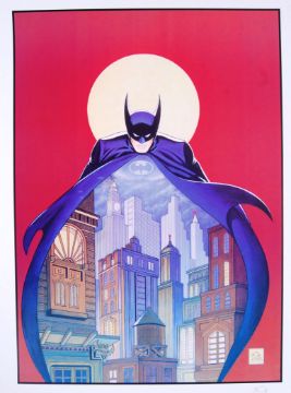 A rare ' Night Vigil Over Gotham ' Batman large lithograph print, by Batman creator Bob Kane. Signed to the margin in pencil by Kane. The print by DC Comics, 1991. Featuring Batman looming over Gotham, with his cape around the city. Rare. 77cm x 56cm