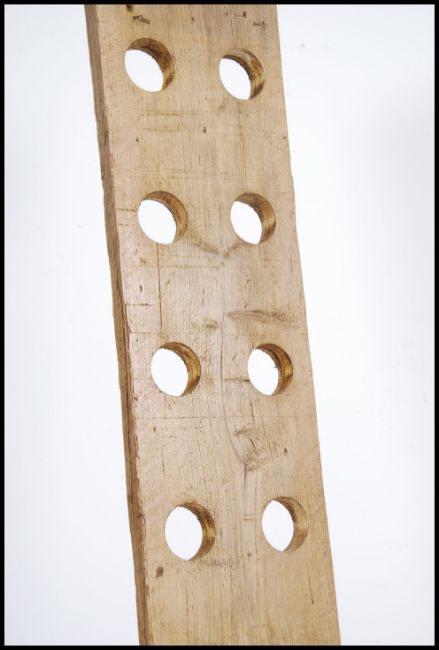 An upcycled 20th century wooden retro wine rack of angular form with pierced holes for bottles being raised on plinth base. Measures: 138cms high.