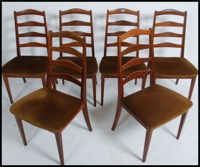 A set of six retro 1970's G Plan teak dining chairs with ladder back solid teak design a original ' old gold ' seat coverings. Measures 90cm high x 49cm wide x 49cm deep.