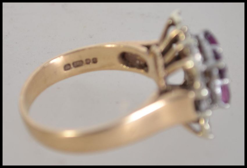 A vintage ladies 9ct gold and ruby diamond ring of cluster form having 4 round cut rubies to illusion setting. Size P / Weight 5.4g
