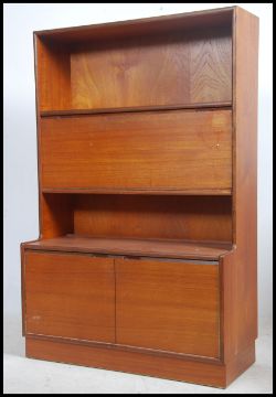 A retro 1970's Danish influenced upright bookcase sideboard cabinet having a breakfront cabinet to base with a series of shelves atop. Measures 141cm high x 91cm wide x 40cm deep.