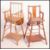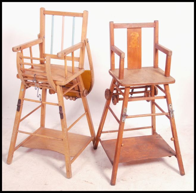 2 vintage mid century retro childs high chairs, both of beech wood construction having turned stretchers with saddle seats. Measures 92cm high x 42cm wide x 42cm deep.