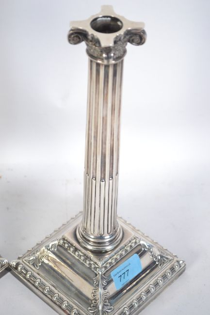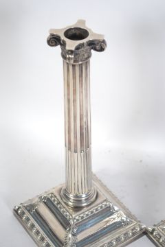 A pair of large silver hallmarked candlesticks by Hawksworth Eyre & Co Ltd, Birmingham 1912. The candlesticks of large neo classical form raised on square plinths cast in relief with leaves rising to a reeded column with single sconces. Marked to underside further for Harrison & SOn of Darlington Silversmiths. Weight total approx 3.2kg / Measure 30cms high