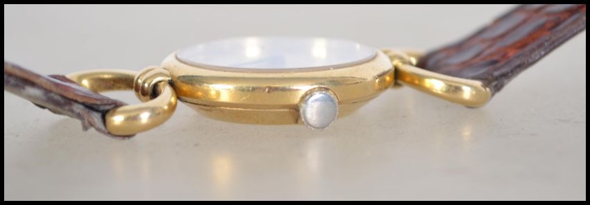 A ladies 18ct gold Baume & Mercier wristwatch - dress watch having roman numeral ring with faceted hands. The verso case stamped 555788 - 38321. Set to a crocodile skin strap. Total weight 20.5g.