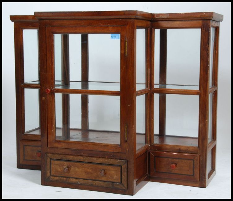 An early 20th century mahogany shop display counter cabinet. The cabinet with breakfront centre having glazed panels all around. To the base a series of drawers. Above a flared top with inlaid walnut and oak panel work