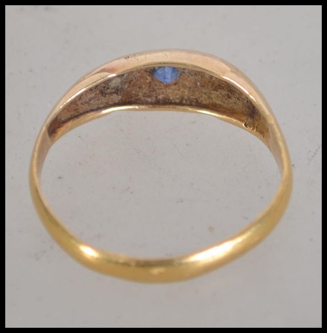 A Victorian hallmarked 22ct gold sapphire and diamond ring in a gypsy mount set with a central sapphire stone with two adjacent diamonds. Weight 2.4g. Size N. Hallmarked Birmingham 1897.