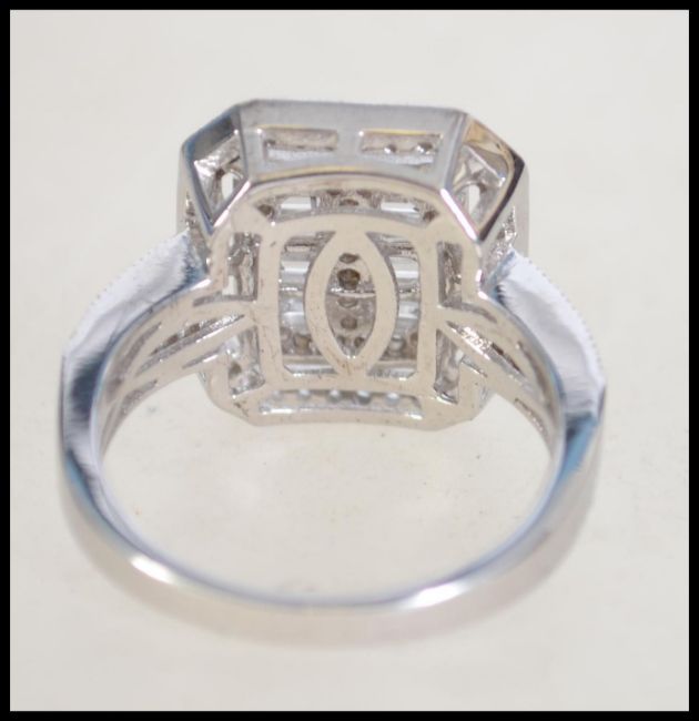 A silver ring set with baguette cut CZ stones. Size O. Weight 5g.