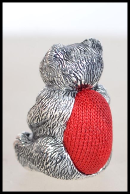 A silver plated pin cushion in the form of a teddy bear having a red baize lining to the back. Weight 15.8g. Measures 3cm high.