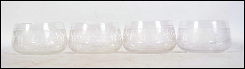 A set of 4 acid etched Aesthetic movement glass bowls. Each with acid etched decoration of oak leaves and vine. Polished pontil marks to the base.