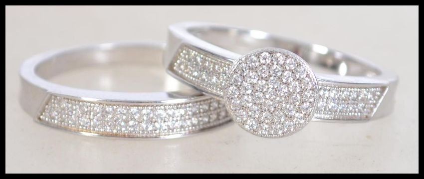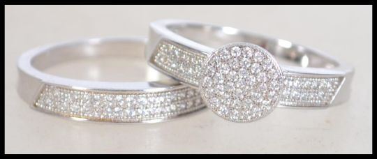 A contemporary 20th century silver cz adorned engagement ring together with a matching eternity ring. Size S. Weight 6g