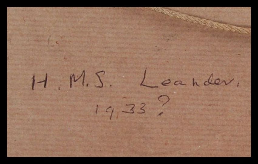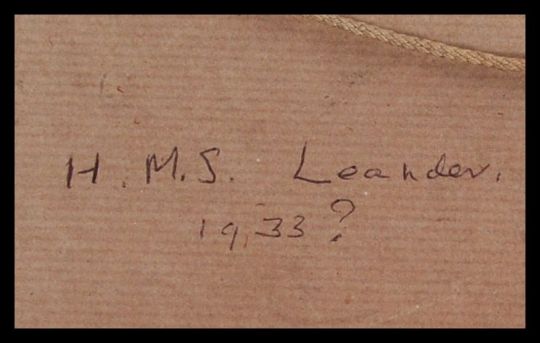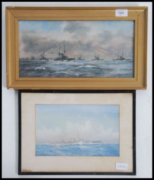 After Harold Wyllie: A print of a British war frigate believed to be HMS Leander circa 1932. Together with another convoy print after Henry Wood. Both framed and glazed. Measures: 37cms high x 18cms wide.