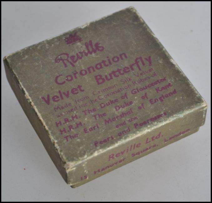 An original 1950's Revills Coronation Velvet Butterfly brooch. In original box being made from crimson silk velvet as used for the coronation robes.