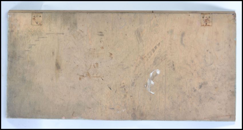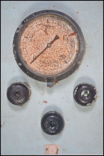 A 20th century industrial instrument panel having applied pressure gauges light fittings and switches mounted on a blue board. Measures 40cm high x 81cm wide.