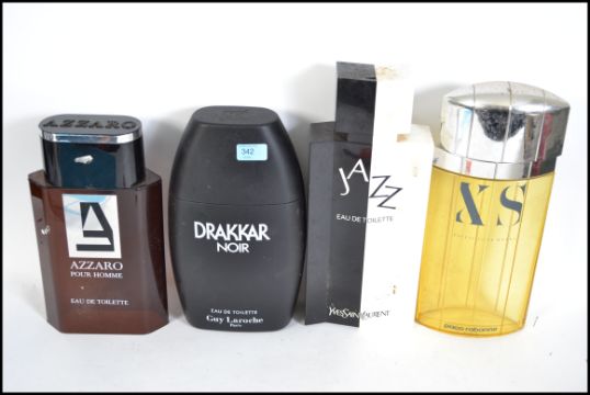 A collection of 4 large shop display perfume - aftershave bottles to include Jazz by Yves Saint Laurent, Azzaro, XS by Paco Rabane & Drakkar Noir by Guy Laroche. The tallest measuring 49cm high.