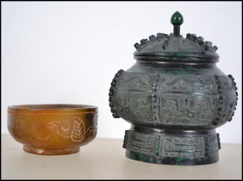 A 20th century Chinese bronze lidded censor bowl having incised character marks to the base. Measures: 10cms high. Together with a believed antique likely 19th century small hand carved Chinese jade bowl. Carved decoration to the other facias.  Measures: 5.5cms wide.