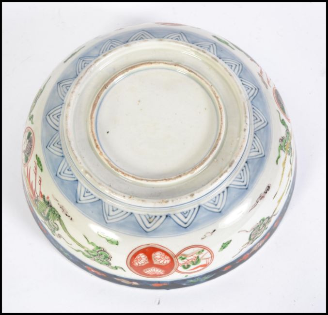 A 19th century Chinese Imari bowl with blue and white glaze having geometric pattern borders with decorative scenes in between having stork to centre of bowl. Measures 25cm wide.