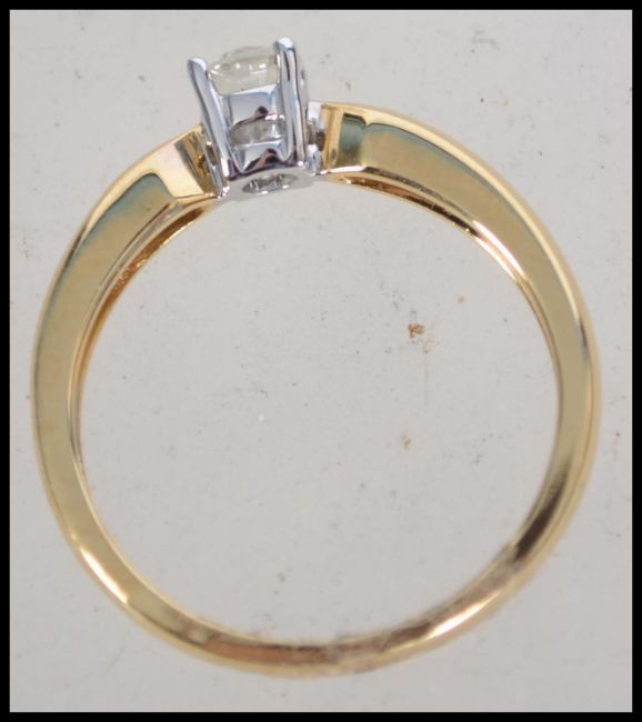 An 18ct gold diamond solitaire ring having a suspension set claw mounted single stone. The diamond approx 30pts. Size N. Weight 3g.