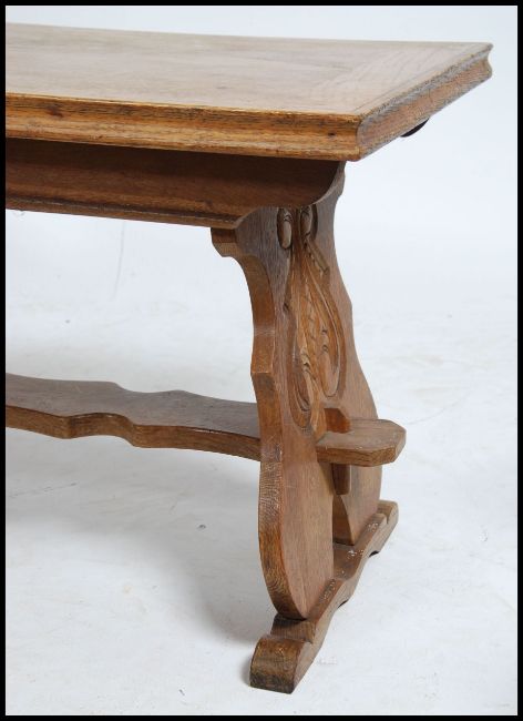 A 20th century oak coffee table in the Quaker style together with a mahogany effect tiled top coffee table. Measure 52cm high x 98cm wide x 49cm deep.