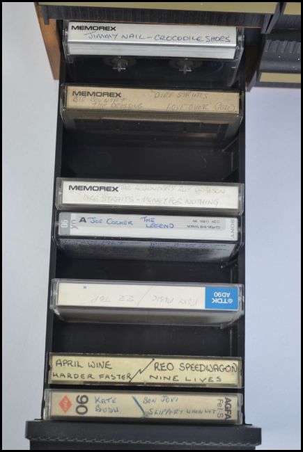 A collection of assorted musical cassette tapes with various artists and genres to include Deep Purple, AC / DC, Bon Jovi and many more artists. All contained within a drawered unit.